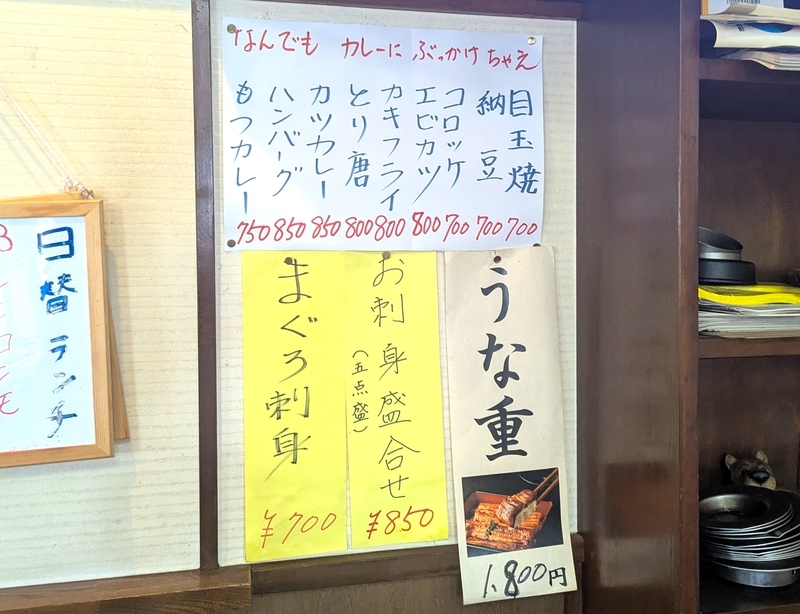 うな重もあって、お刺身盛合せもあって、まぐろ刺身もあります。