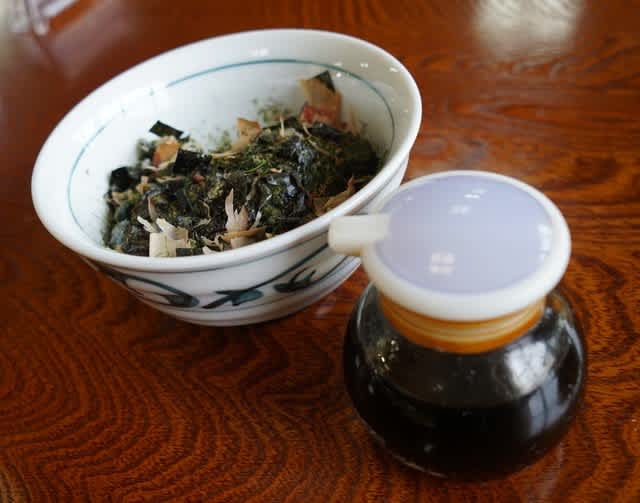 ご飯の上に、焼きのりと鰹節と糸青海苔の「ふりかけ」がかかっています。